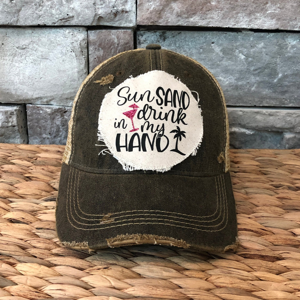BohoGroove “Sun, Sand, Drink in My Hand” Hat – Funny Summer Snapback Trucker | Vintage Distressed Beach Party Baseball Cap